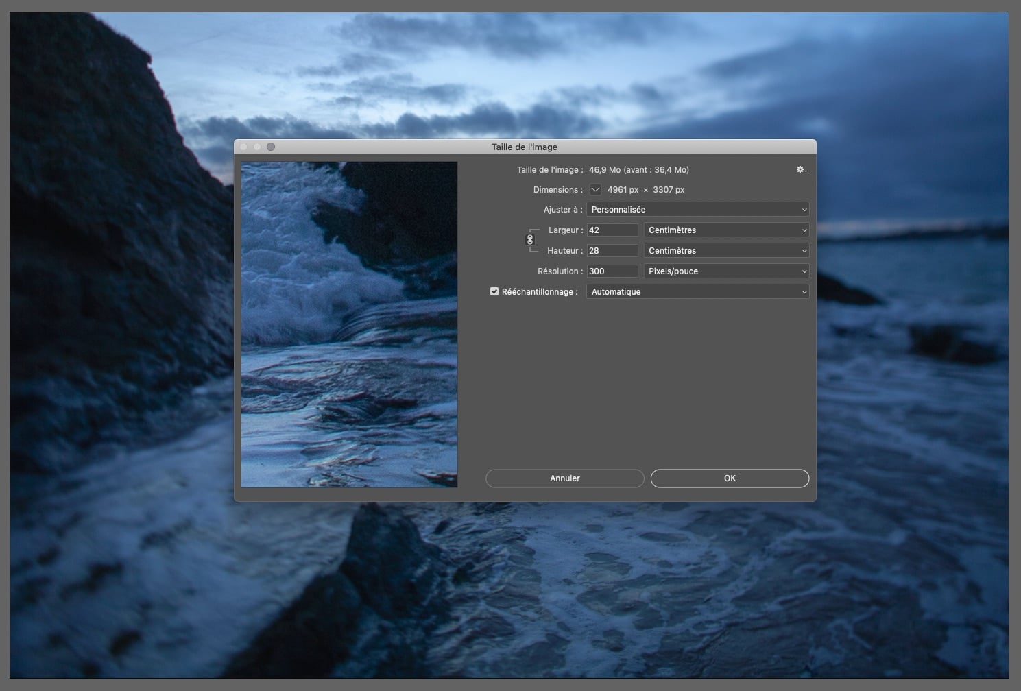 Notre format d’impression maximal est le A4 vertical (cela donne un A3 horizontal), donc vos images ne devraient jamais avoir besoin de mesurer plus de 29,7×42 cm en 300 dpi ! Pensez à tailler vos images en conséquence avant de les importer, pour optimiser votre temps de téléchargement.