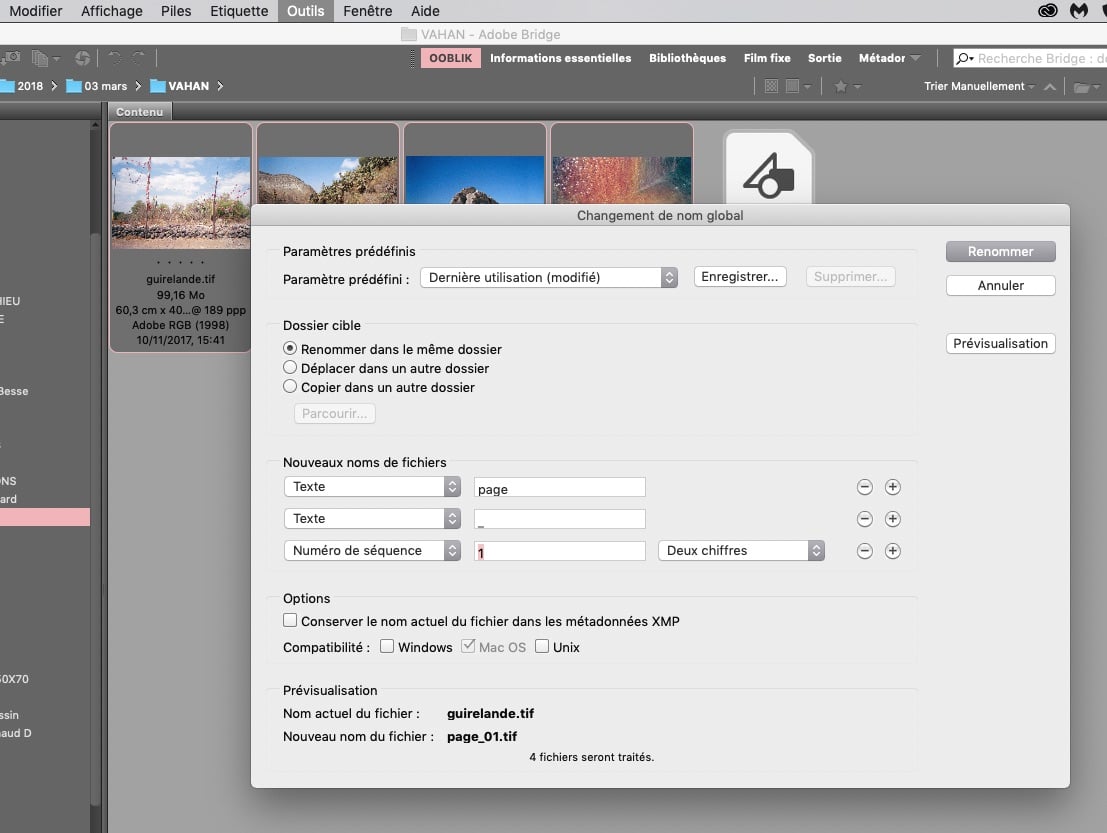 Vous pouvez le faire dans Bridge menu Outils/Changement de nom global (ou directement dans le Finder sous Mac OS X, menu Fichier/Renommer), çà vous permet de mieux vous organiser!